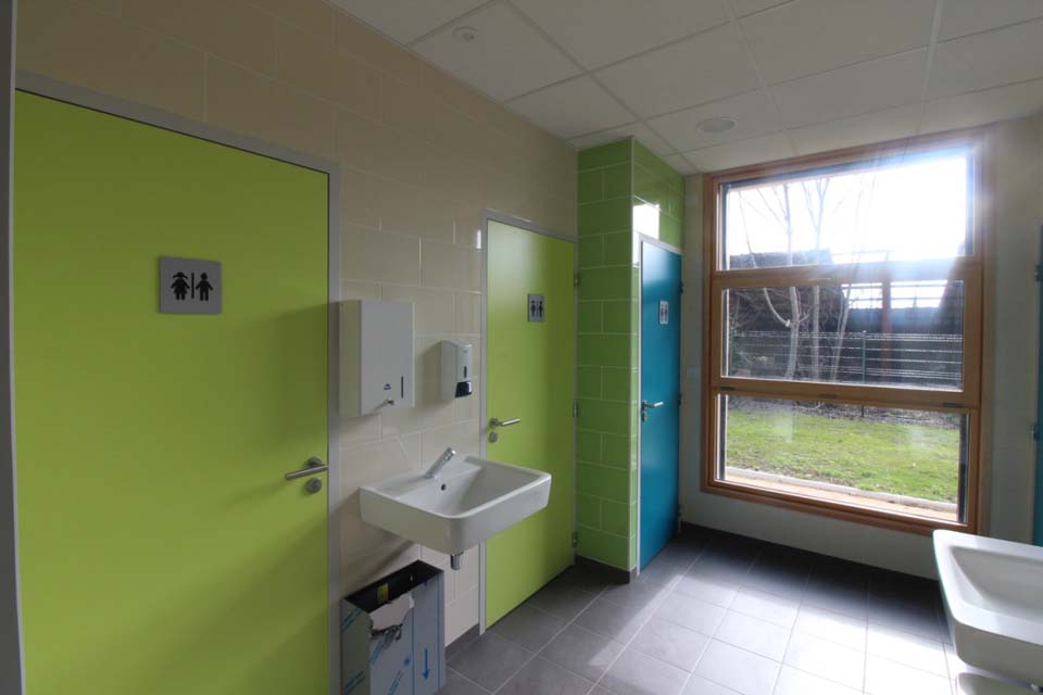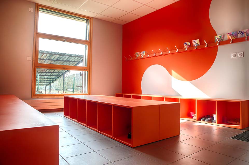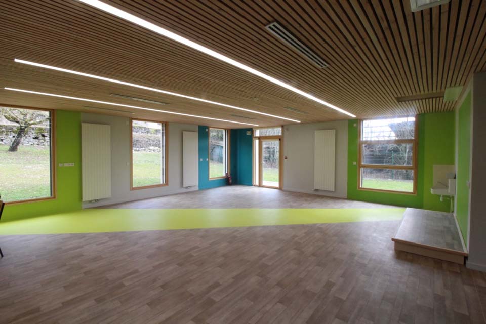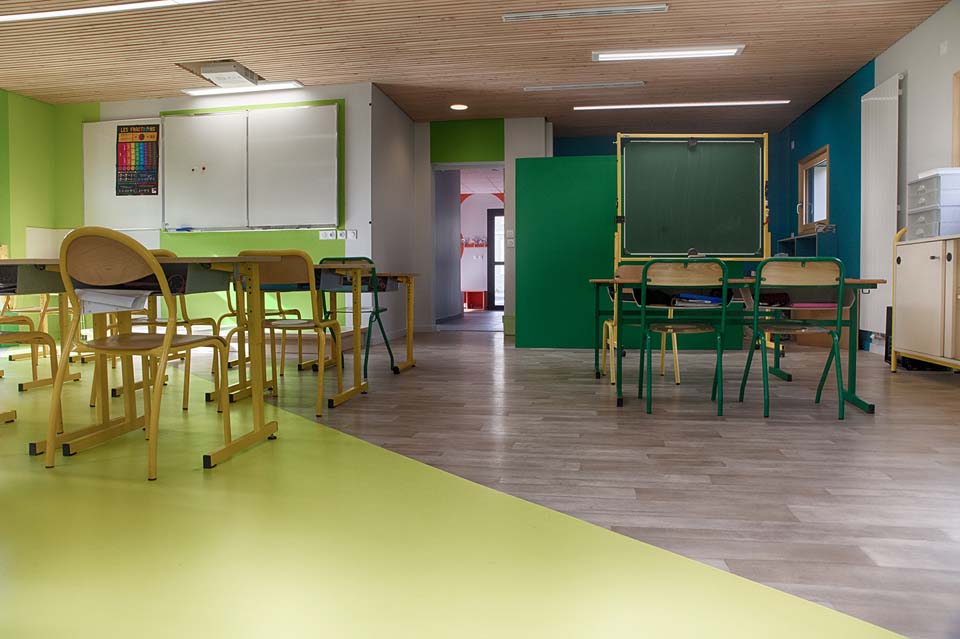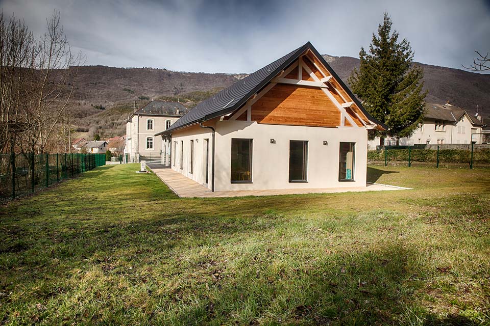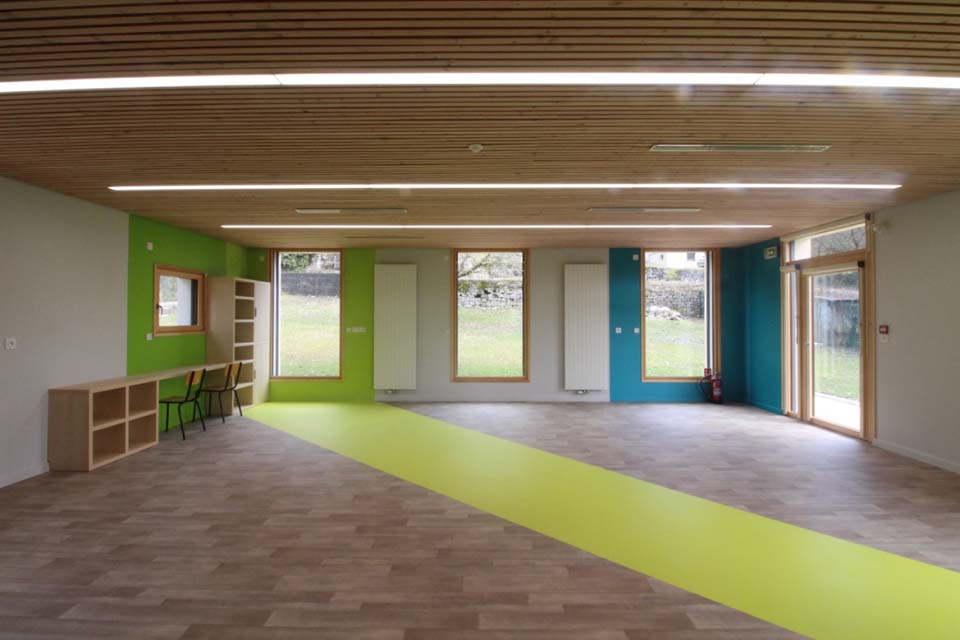 Le nouveau bâtiment vient s’insérer dans une vaste prairie en continuité avec le corps de bâtiment de l’école existante. Il est compact et regroupe l’ensemble les fonctions techniques et sanitaires pour une salle de classe. Il comporte en plus de cette salle de classe un vaste préau qui complète l’espace de jeux de la cour. Le bâtiment est réalisé avec des matériaux locaux et a un volume trapu semblable aux fermes bugistes des alentours.