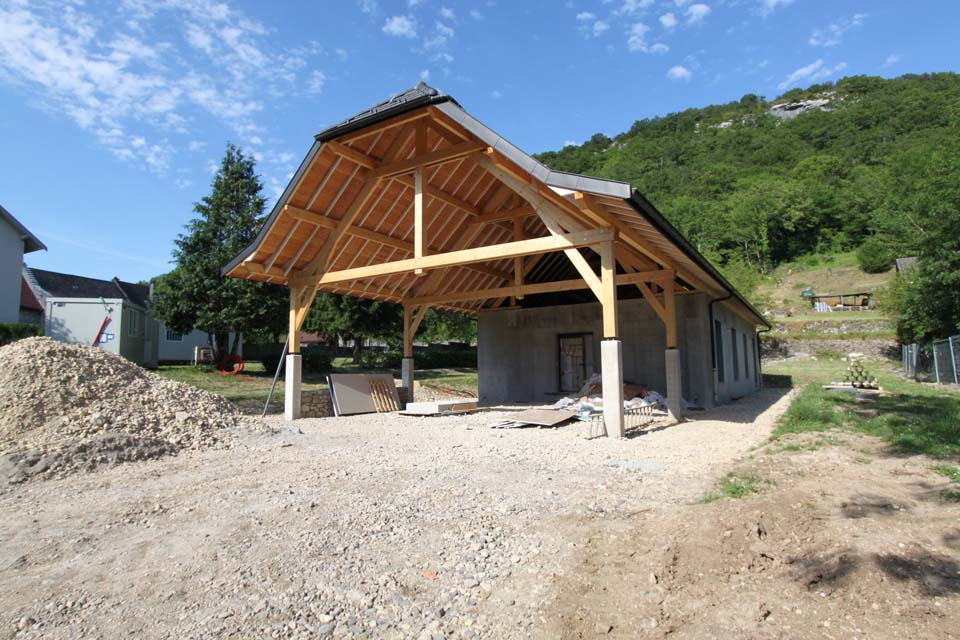 La charpente bois est de type traditionnel, laissée apparente sous le préau. Elle donne un rythme à la longueur de la façade. Les pignons sont bardés sur le second niveau de la façade.