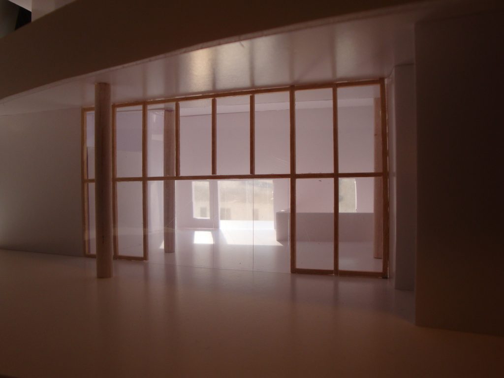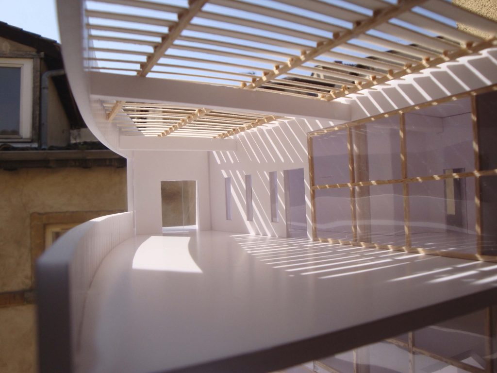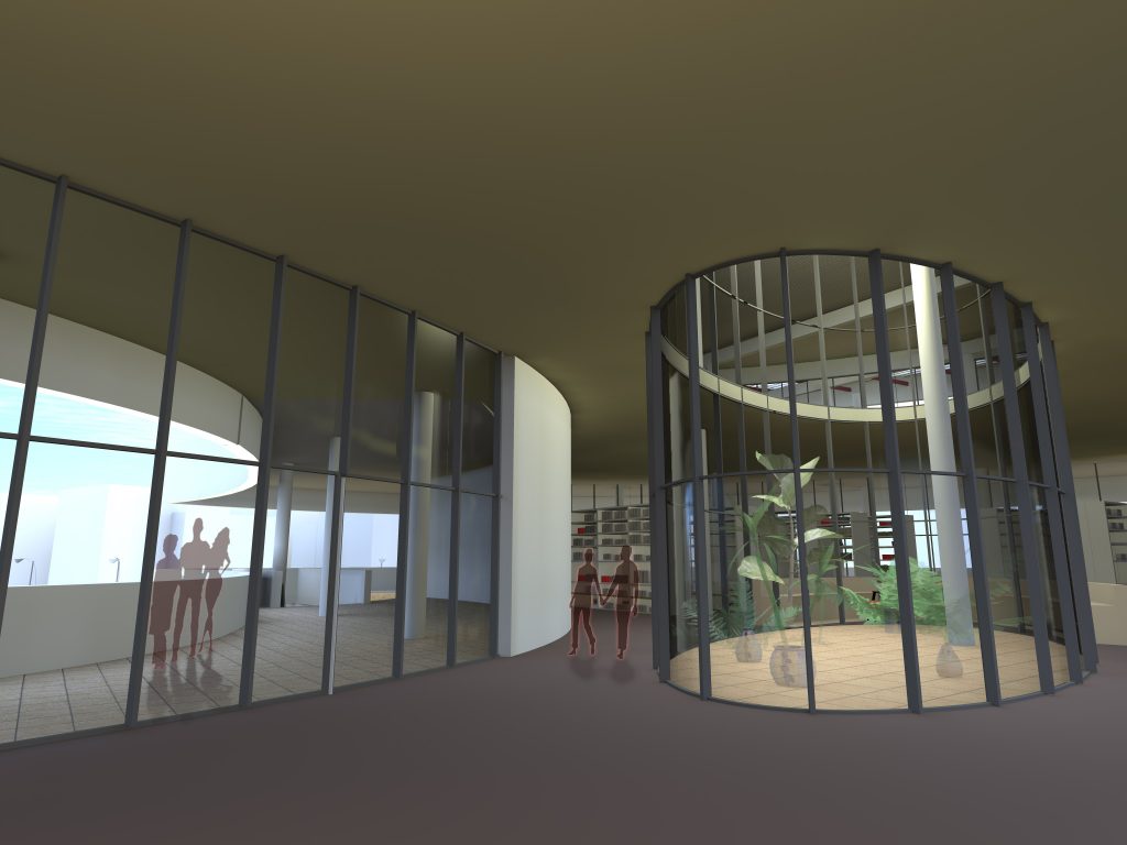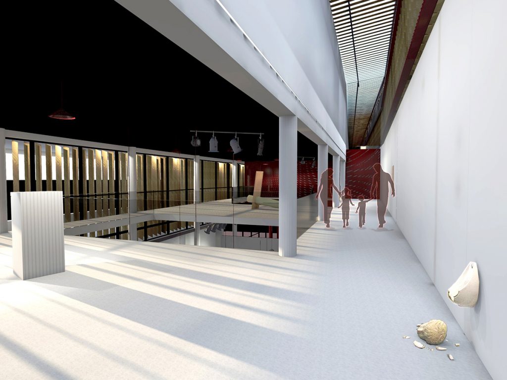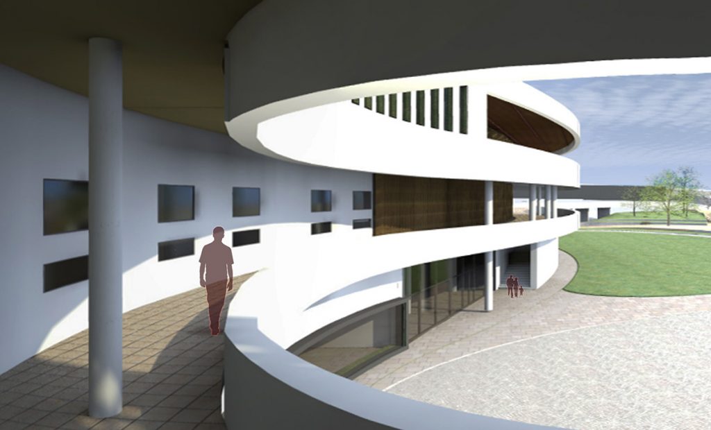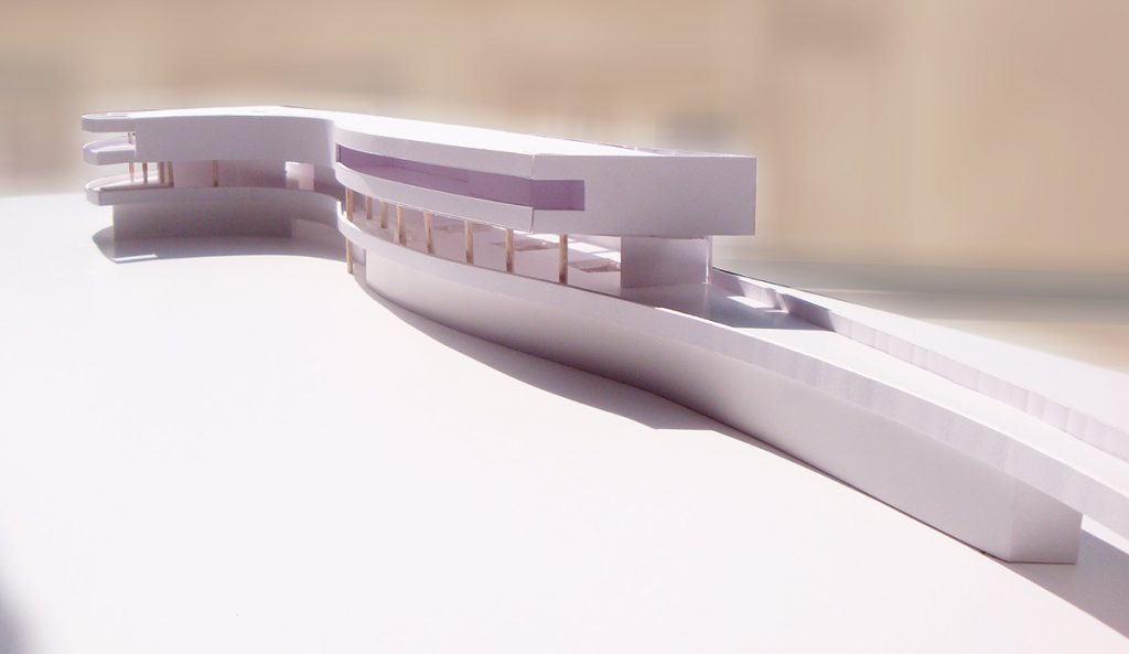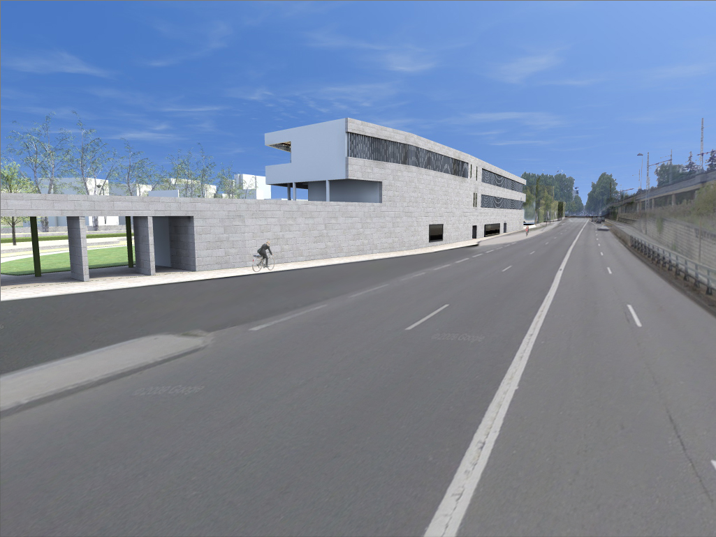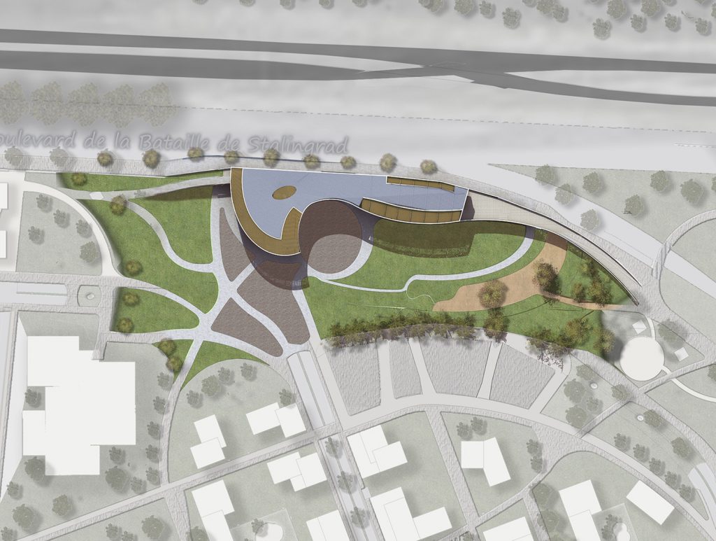 Le centre d’art est développé en continuité avec la topographie du site, il relie les voies de déplacements doux qui sont l’objet principal du projet urbain attenant. Ce bâtiment est traversé par une voie piétonne, afin de connecter le parking-relai du quartier aux pistes cyclables partant au nord vers une nouvelle navette fluviale.
