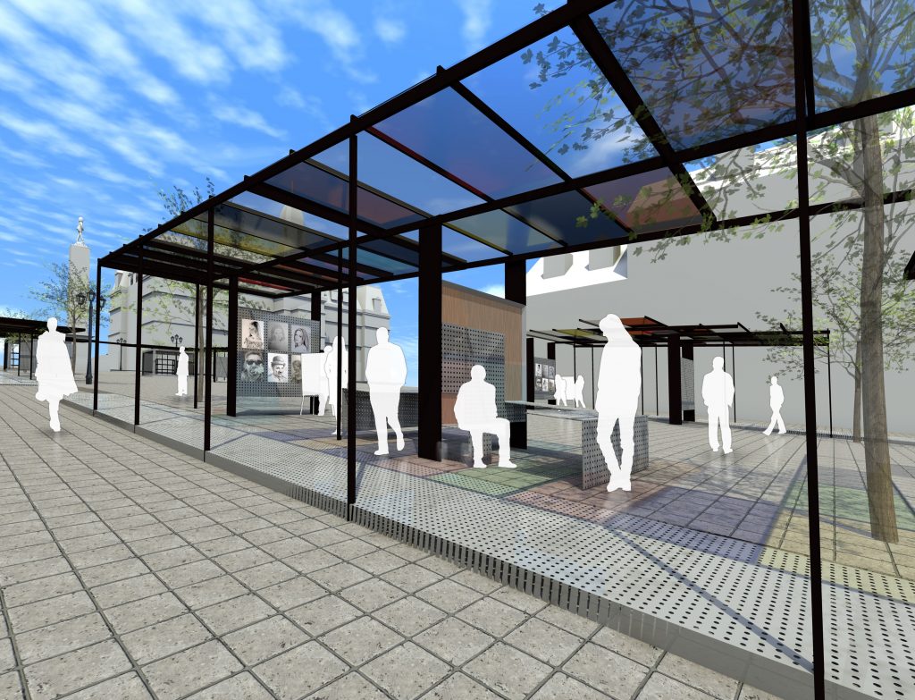 L’intervention vise à unifier l’espace, à mieux exploiter la partie centrale et à donner une identité propre aux lieux. Des structures contemporaines s’inscrivent au site tout en conservant la richesse historique qu’on y retrouve. Pour ce faire, ces structures de style pergolas de panneaux translucides colorés viennent couvrir certaines parties de la place de façon à offrir aux passants et aux visiteurs la possibilité de s’abriter tout en gardant une excellente luminosité lors des journées ensoleillées. Ces structures servent également aux artisans en intégrant à même leurs appuis, des modules de présentation, d’affichage et d’assise.