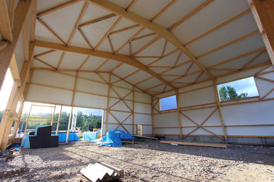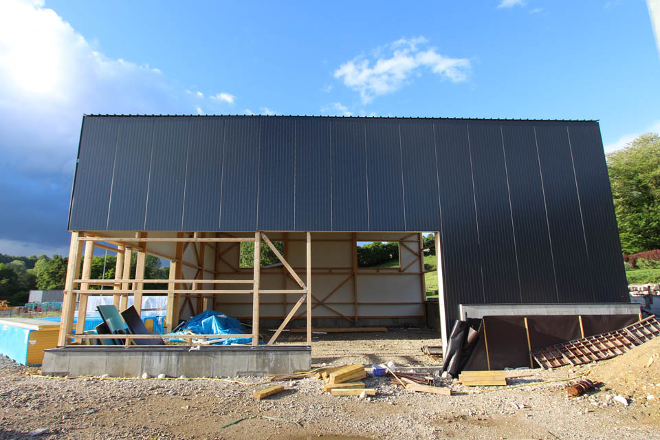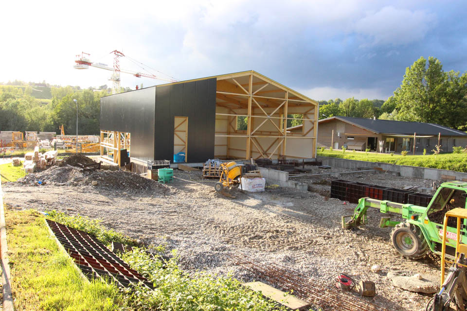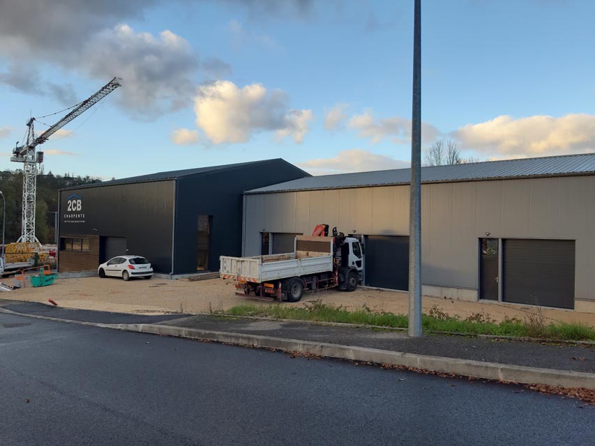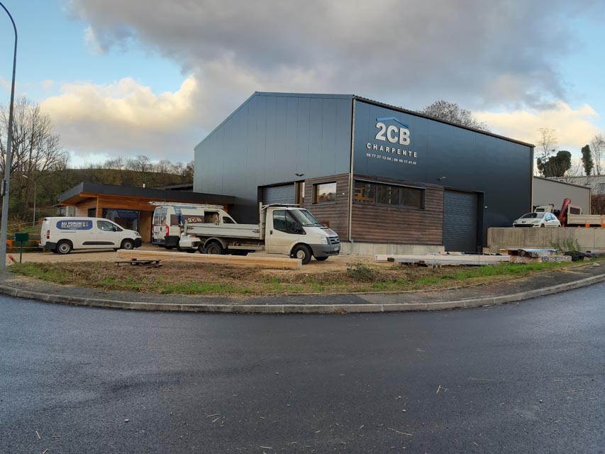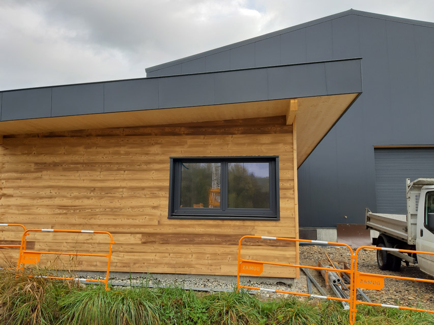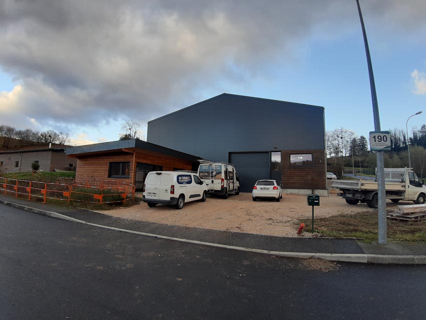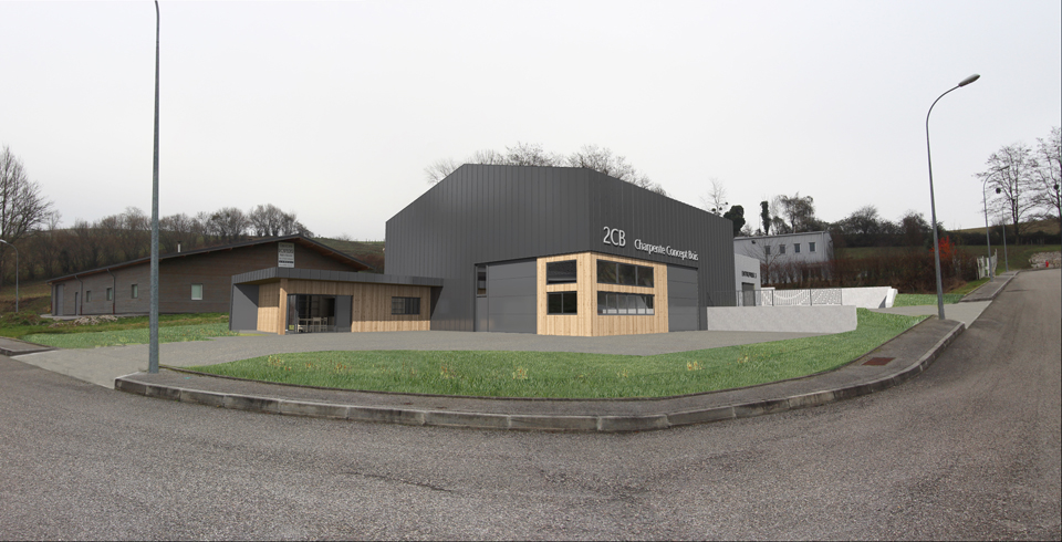 Le projet se compose de volumes simples, avec des toitures sans débords, coupés par des ouvertures régulières. L’angle du grand volume est découpé avec un empiècement de bois, pour alléger le bloc, et lier le volume atelier à celui des bureaux.