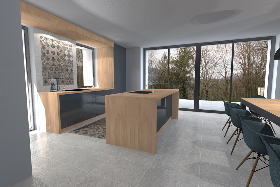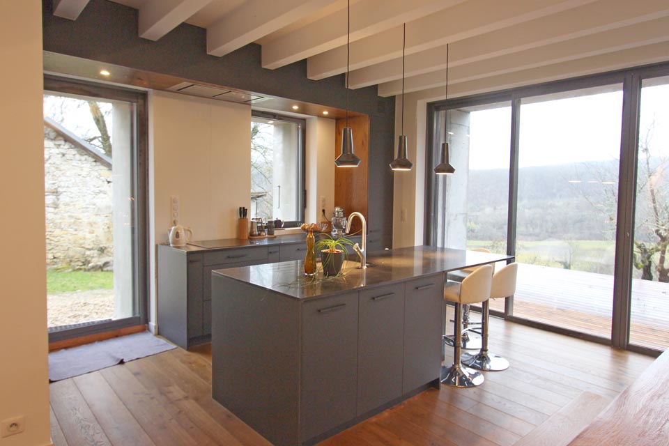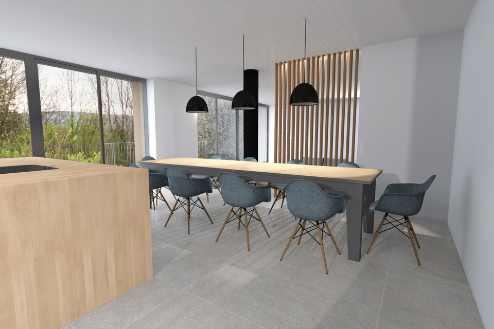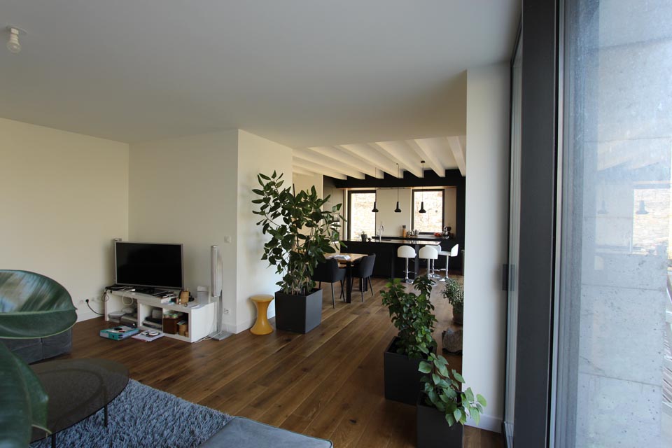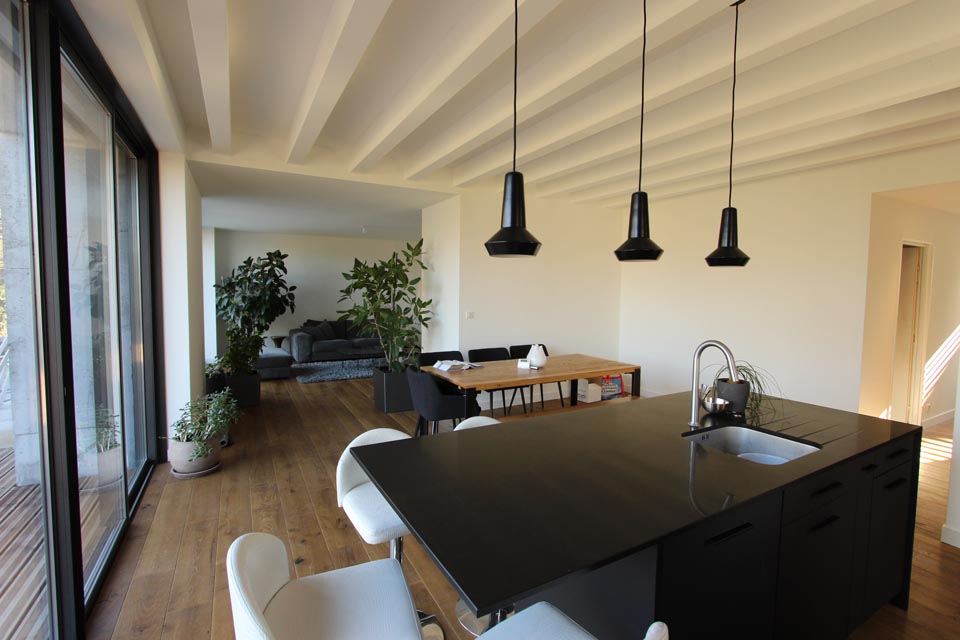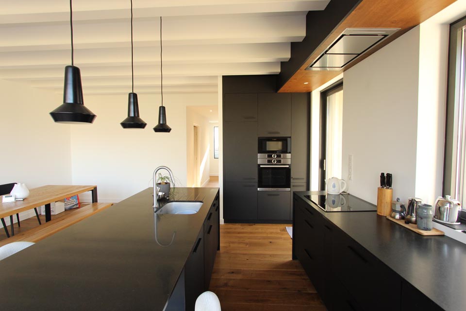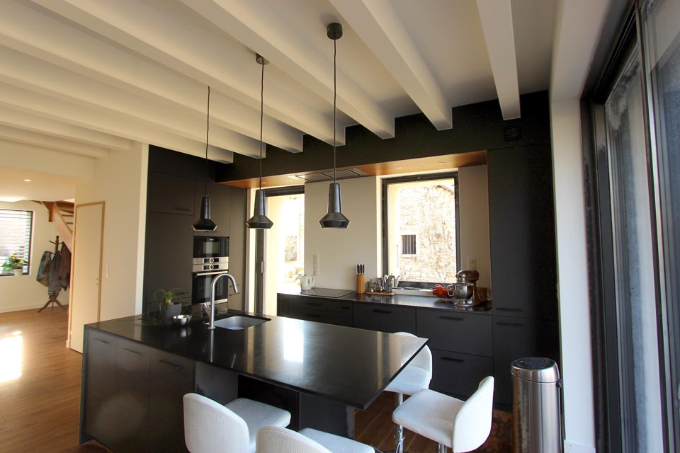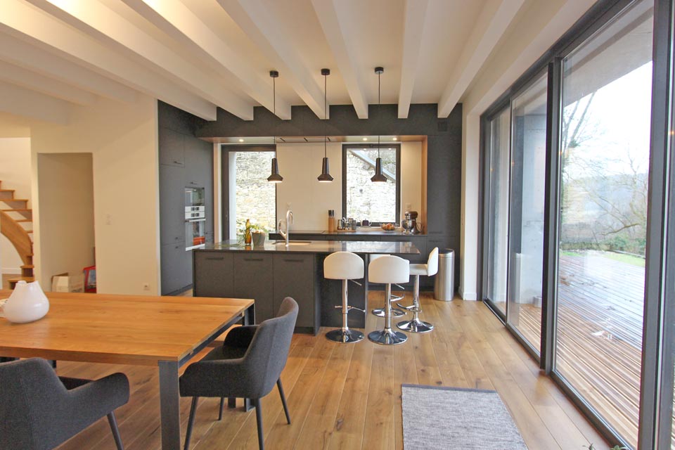 Les espaces intérieurs sont complètement réaménagés pour s’adapter à un usage moderne des espaces de vie. Dès l’entrée, la vue s’ouvre sur un grand espace de vie ouvert au rez-de-chaussée. L’espace cuisine et salle à manger, espace central de l’habitation, dispose d’un large îlot central permettant de cuisiner mais aussi de recevoir, et d’un accès direct sur la terrasse par une large baie. Le salon est ouvert sur la cuisine et la salle à manger mais dispose d’une certaine intimité avec une séparation en claire-voie bois. A l’étage, les 5 pièces existantes sont modifiées pour accueillir une grande chambre parentale avec dressing, une seconde chambre et une salle de bain.