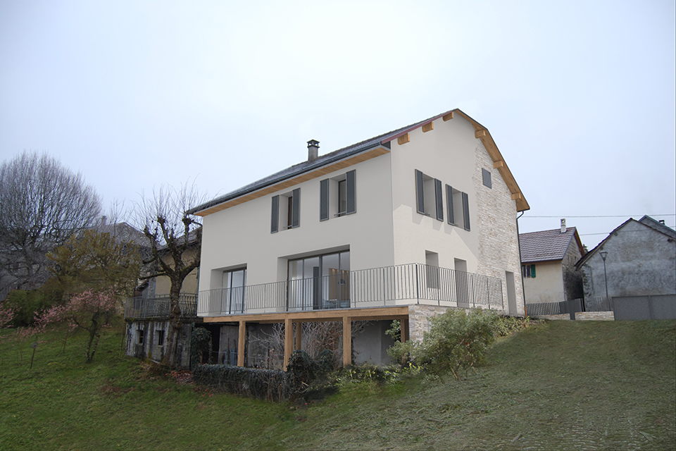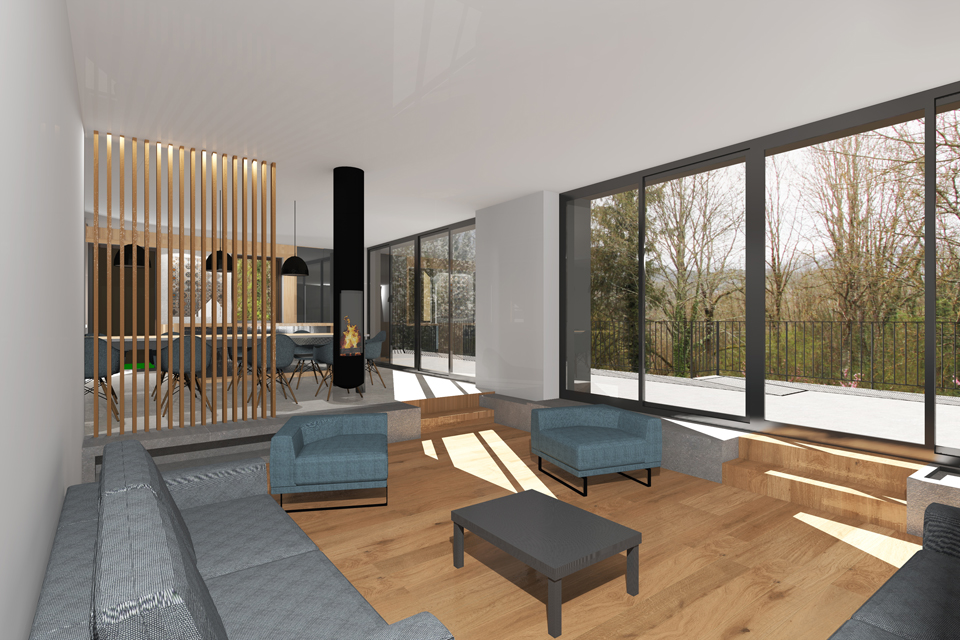 Les espaces extérieurs sont réaménagés avec notamment la création d’une grande terrasse au Sud-Ouest de l’habitation en bois, en prolongement du balcon filant existant.