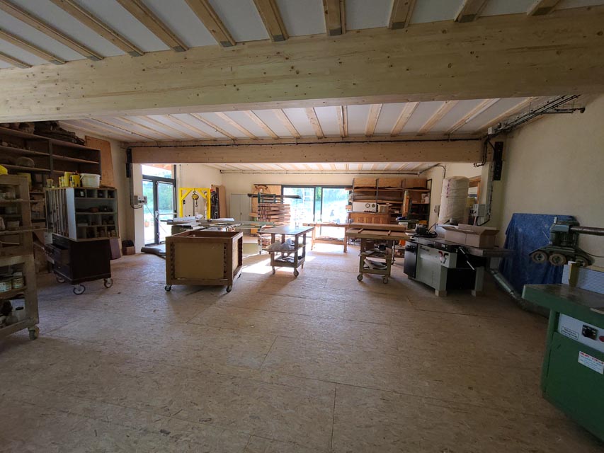 Dans le volume créé, souligné par une charpente traditionnelle, vous trouverez aujourd’hui l’Atelier des Roches avec les réalisations en bois d’Andreas.