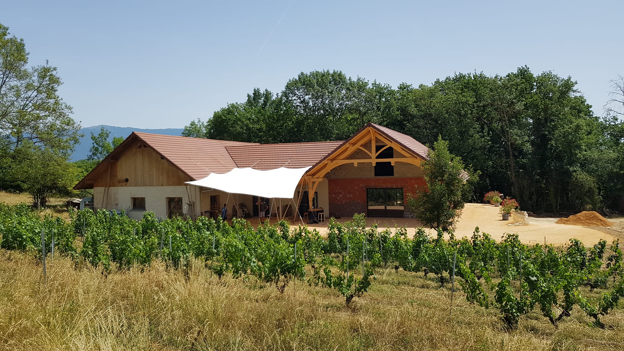 L’extension vient s’accoler au bâtiment existant et reprend ses codes architecturaux. On retrouve un espace extérieur abrité par une avancée de toiture, une charpente traditionnelle, et de grandes ouvertures pour laisser entrer la lumière dans les espaces de production. La plateforme ceinturant le bâtiment est conservée pour les besoins des deux activités.