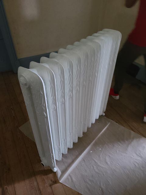 Dans ce projet, il a été question de valoriser l’existant : les parquets ont été restaurés et les carreaux de ciment présents ont été déposés avec soin et réutilisés dans le nouvel aménagement. Les moulures de cheminées ont quant à elles été conservées pour y installer un insert à bois performant.
