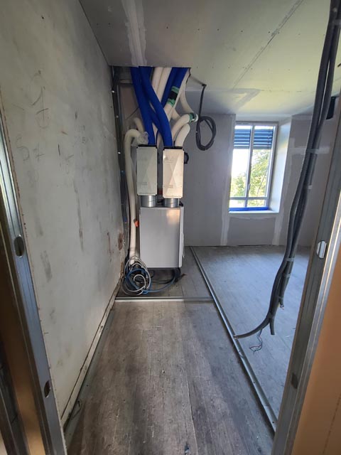 Le chauffage est assuré par une chaudière à granules. Le renouvellement de l’air est assuré par un puits canadien installé dans le jardin couplé à une VMC double flux.