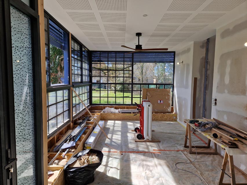 L’agencement du niveau de vie a été repensé pour accueillir les pièces de vie et la chambre parentale. Accolée à la façade Sud, la véranda a été rénovée en gardant son caractère très marqué : larges baies à meneaux, lambrequins dessiné sur-mesure. Une double teinte a été choisie pour les menuiseries : bleu pigeon conserver l’aspect extérieur, noir à l’intérieur pour apporter une touche contemporaine. A fleur de ses dernières, une banquette équipée d’une plinthe chauffante a été dessinée sur-mesure pour meubler et chauffer la pièce.