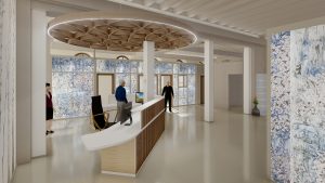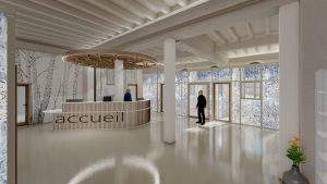 Les différents services, état civil ou encore urbanisme, seront facilement fléchés depuis cet espace central. Des structures métalliques avec toiles tendues inspirées de l’artiste Salomé FAUC permettront de délimiter des bureaux individuels installés de part et d’autre du hall afin d’assurer une certaine intimité aux usagers lors de leur rendez-vous. Ces cloisons translucides participeront à la transparence des lieux. De plus, une vaste banque d’accueil a été installée au centre du hall. Grâce à la conception d’une structure en bois circulaire au plafond, l’entrée se distinguera et facilitera la circulation des visiteurs.