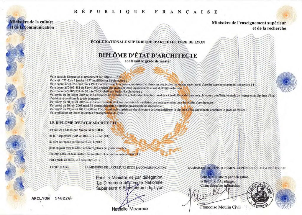 2012 – Diplôme d’État d’architecte (Master). École Nationale d’Architecture de Lyon (69)